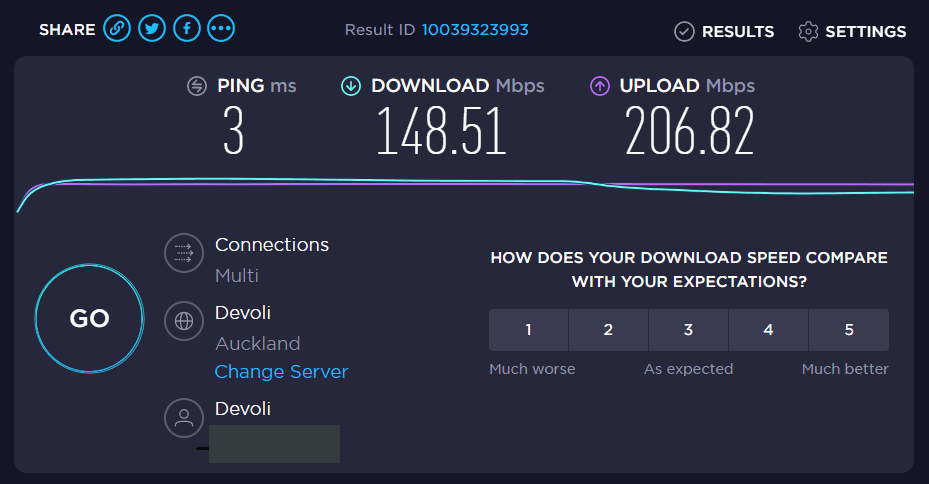 Firstly, your device will need to be plugged into an ethernet cable. Open your internet browser and do a speed test. We recommend using speedtest.net. Before pressing “Go”, check that you are using “Devoli” as the server: